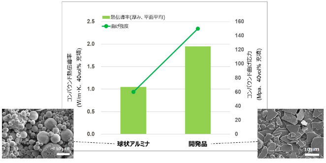 在汽车和电子领域,随着无人驾驶、电动汽车、连接、共享和新一代通信标准5G的普及,零件的发展趋势兼备小型化和高性能。与此同时,如何解决设备内部产生的热量的重要性也逐步凸显。氧化铝材料具有很高的热稳定性,是当前流行的用于汽车和电子设备零部件散热填料。为了赋予树脂更优的导热性,在混合时会设计成使用大量填料,但是使用大量填料会降低成型性,也会造成降低成型品机械强度。