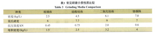 化学组成及制造工艺的差异决定研磨介质的晶体结构的不同,继而决定了研磨介质不同的抗压强度和耐磨性,成分的含量不同决定了研磨介质的密度,而由动力学公式P=mv可知,研磨介质的冲量P与研磨介质的质量成正比,研磨介质的密度越大,动能越大,研磨效率也就越高。下图是常用的研磨介质的参数对比。