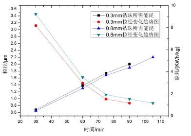 对不同直径氧化锆珠的研磨效率进行了研究比较,采用直径为 0.3mm 的氧化锆珠比采用0.8mm 的氧化锆珠研磨效率高。随着氧化锆珠使用时间的不断增加,氧化锆珠的研磨效率不断下降,影响墨水的最终性能。根据砂磨机的功率变化计算出不同时间氧化锆珠的加入量以保证氧化锆珠的研磨效率,从而保证陶瓷墨水质量的稳定。
