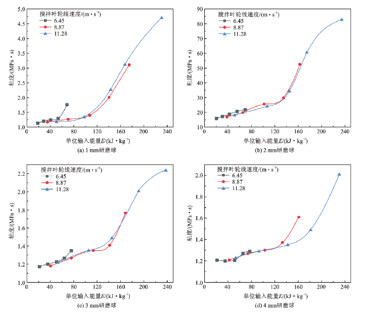 矿浆粘度表现为对研磨球运动的阻力。图4对比了不同研磨球尺寸及搅拌转速下矿浆粘度的变化。总体来看,随着能量的不断输入,磨矿产品粒度变细,矿浆粘度不断增加,且表现出一定的规律,即随着能量的持续输入,粘度变大的趋势快速增大,可知对研磨球运动的阻力也在急剧增加,导致研磨球的运动变缓,磨矿效果下降,这可能就是整个磨矿过程中能量利用率逐渐变低的原因。