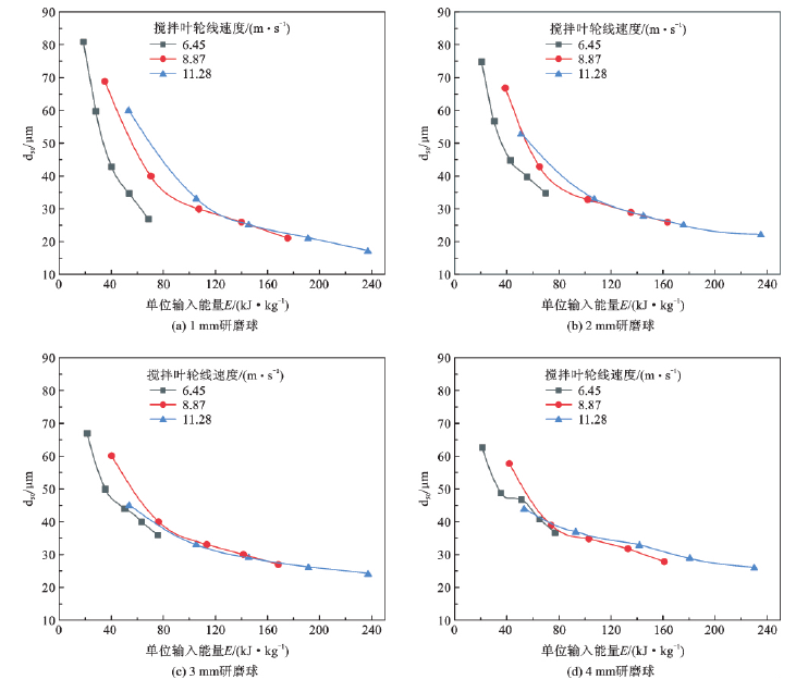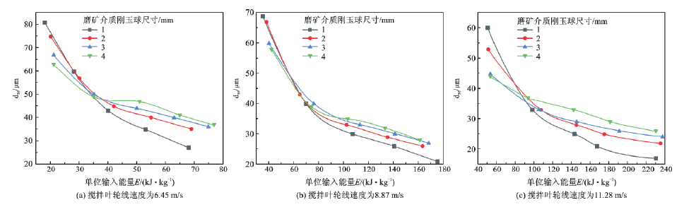 总体来看,在磨矿阶段初期能量输入较低时,研磨球尺寸越大,磨矿产品的粒度越细,说明大球的能量利用率高; 而随着能量输入的持续增加,小尺寸研磨器的磨矿粒度更细,说明磨矿后期小球能量利用率高,细磨效果越好。进一步分析可以发现,存在着一个能量输入节点,节点前,大研磨球能量利用率高,节点后,小球能量利用率高,细磨效果越好。不同的搅拌转速下,大、小球优势转变的能量输入节点并不同,搅拌叶轮转速为 6. 45 m/s、8. 87 m/s、11. 28 m/s 时的转变节点分别为 35 k J/kg、55 k J/kg、85 k J/kg。