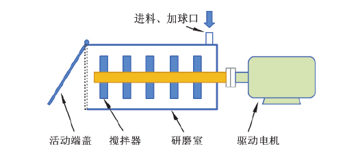 磨矿设备所用磨矿设备为 6 L 卧式搅拌磨,其基本结构如图 1 所示,磨机筒体结构为 176 mm × 310mm,搅拌盘直径为 156 mm。