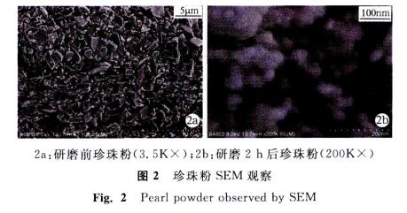 2.2SEM观察结从图2可以看出,研磨前珍珠粉粒中含有大量文石板片及一些小碎片,形状不规则,大小不等,其中大小在2~5um范围内的文石板片较多;研磨的珍珠粉主要为类形颗粒,大小 均,使用NanoMeasurer1.2软件测量颗粒粒径大小。主要分布30~50nm之间。