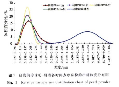 在本研究中,在珍珠粉与无水乙醇以重量体积比约为1:15,氧化锆磨球直径0.1mm,球磨机转速1800r/min等系列参数下,研磨到90min时的颗粒粒径分布最均匀。因此,在各研究时间点中,90