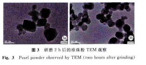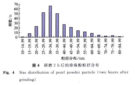 在最新的一项纳米碳酸钙标准中,要求颗粒平均粒径(TEM/SEM)≤100am_1。20l1年,欧盟颁布的纳米材料的定义为:是含有粒子的天然、偶然产生或人造生产的材料,这些粒子以自由态、聚集态或团聚体形式存在,在粒子粒径分布中,50%或以上的粒子的一维或多维的尺寸在1~100nm大小范围内。本研究中对研磨后的珍珠粉分布不属于正态分布,它的算术平均粒径为37.45nm,中位数为34.72nm,粒径分布主要集中在20"--,60am,极小值和极大值分别为13.47nm和83.65nm,按照我国和欧盟对纳米材料的要求,本研究中以无水乙醇为液体介质研磨后的珍珠粉符合纳米材料标准,可以认为研磨后的珍珠粉为纳米级珍珠粉。