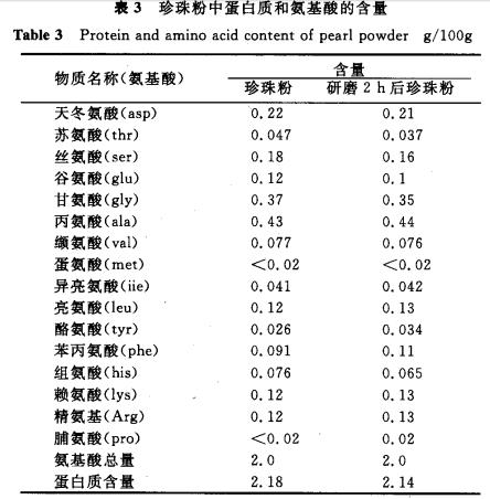 2.4蛋白质、氨基酸检测结果从表3中可以看出,珍珠粉中含有16种氨基酸,其中含7种氨基酸为人体必需氨基酸;研磨前珍珠粉中蛋白质约为2.18%,氨基酸约为2.0%;研磨后的珍珠粉中蛋白质、氨基酸含量基本没变,少数氨基酸含量有增高。
