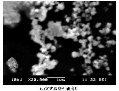 原始氧化锆粉以及经不同研磨设备研磨后氧化锆粉体的SEM 照片见3。