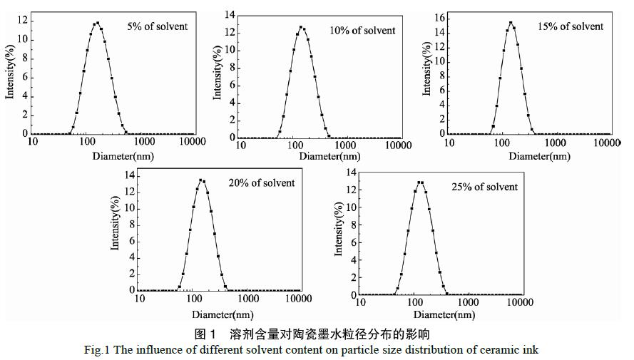 以Cu-Cr-O 陶瓷色料为着色剂,以丙二醇、二乙二醇作为溶剂,添加分散剂、消泡剂等其它助剂进行均匀混合。实验一:按溶剂含量为5%、10%、15%、20%、25%五个不同比例进行配比,将配好的溶液放入分散机中进行分散;分散后的浆料移入砂磨机中进行研磨,最后通过过滤装置进行过滤,所得滤液即为水性黑色陶瓷墨水;实验二:在确定最佳溶剂含量的条件下,添加不同生产厂家的分散剂,进行分散、研磨、过滤等一系列相同的操作,得到水性黑色陶瓷墨水。