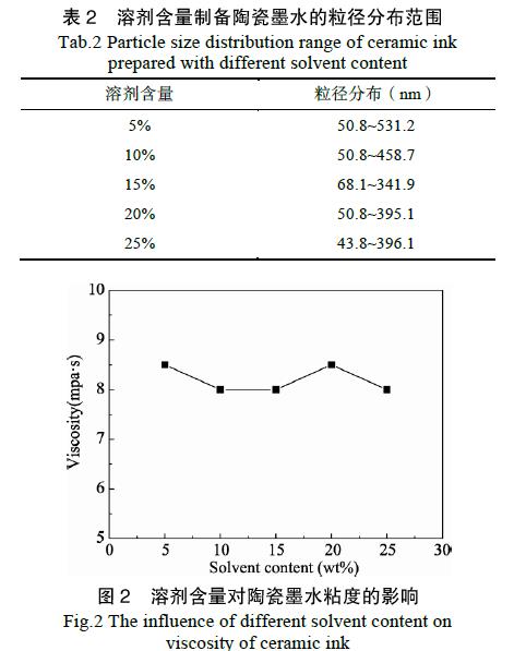 其他条件固定不变的情况下,考察不同溶剂含量对陶瓷墨水粘度的影响,如图2 所示。