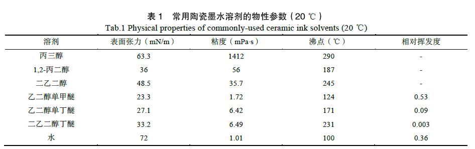 溶剂在陶瓷墨水中的作用是载体,它将着色颗粒、分散剂、助剂等成分分散或溶解在其中,从而形成一个新的稳定体系。它可以调节陶瓷墨水体系的粘度和流变性,不同的溶剂对着色颗粒分散性能和助剂的溶解性能不一样。选择溶剂应该考虑与着色剂的相容性、分散剂和助剂的溶解性。有相关文献[18-19]报告,至少选择一种低挥发性溶剂和一种高挥发性溶剂。要找到一个稳定点,需要经过无数次实验来验证,表1 为常见的几种用作水性陶瓷墨水溶剂。
