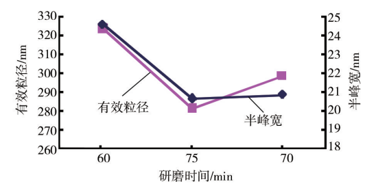 由图分析可知,分散剂685效果较优,其分散的粒径大小及平均粒径较小,并且在粒径分布上集中于平均粒径的程度也较好,这里以分散剂685作为研究对象,研究研磨时间的影响。