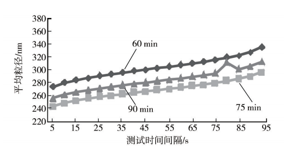 结果见图。由图可知,在实验条件下,分散剂685在研磨时间60,75,90min下的有效粒径分别为324.0,281.7,299.0nm,半峰宽分别为24.6,20.7,20.9nm,从有效粒径可知,氧化锆珠研磨时间为75min时,色浆有效粒径较小,分散效果较佳,随着研磨进行,预聚物逐渐填充色浆粒子分散的间隙,随体系达到均匀分散状态。从粒径分布集中程度看,75min时半峰宽比较小,表明分散粒子的粒径大小集中于平均粒径左右,并且有效粒径和半峰宽具有相似的走向,可见两者存在一定联系。由图可知,随着测量的进行,平均粒径都有增加的趋势,但比较缓慢,并且研磨时间为75min时,平均粒径较小,短时间内随研磨时间增加,粒径减少,一定程度后由于粒径小带来比表面能大,导致粒径大小随粒子聚集而增大。从粒径评价考虑,研磨时间为75min时的粒径分散效果好。所以,该分散剂的最佳研磨时间的75min,即在最佳时间下研磨得到的分散色浆粒径最小。综上在分散剂为685且研磨时间为75min的条件下研磨效果最佳,可得到最佳分散效果。