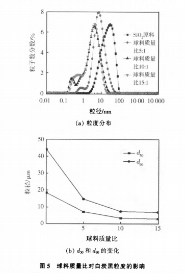 图5所示为球料比分别是0、5、10、15时炭黑研磨实验结果。由图可知,随着球料比的增大,炭黑研磨产物的粒度分布曲线整体显著向左移动。当球料比为5时,最大分布频率的粒径减小至6~7斗m。当球料比为10和15时.最大分布频率的粒径减小至小于4斗m。研磨产物的中位粒径由研磨前的18.434斗m减小至约为3.8斗m。显然,湿法研磨使炭黑实现了明显的解聚。当球料比大于10时,研磨产物粒径虽然也有变化,但是变化不明显。由此可知,最佳球料比为10。