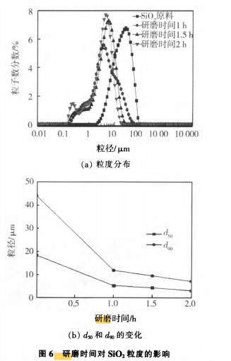 由图可知,随着浆体中炭黑含量的逐渐增大,Si0:颗粒粒径变小,粒度分布变窄。当质量分数接近10%时颗粒解聚效果最佳,粒度分布接近于正态分布,中位粒径从18.434斗m减小至约3.8斗m,因此,浆体中炭黑的最佳质量分数为10%。
